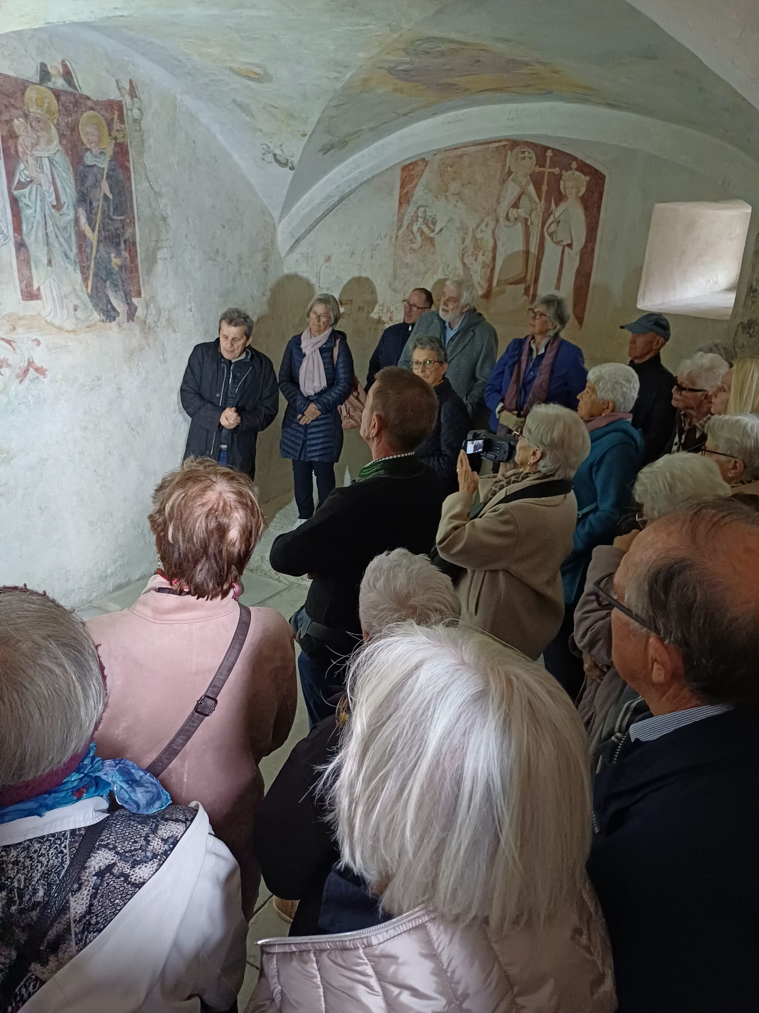 Besonders beeindruckend präsentierte sich auch die Michaelskapelle, wo noch gotische Fresken aus dem 15. Jahrhundert zu sehen sind – darunter eine Darstellung des Erzengels Michael im Jüngsten Gericht, die verschiedene Techniken der Wandmalereien sichtbar macht. Im Gegensatz zu der Sekkomalerei auf trockenem Untergrund wirken die Fresken, bei denen die Farbe auf nassen Putz aufgetragen wird, kräftiger und leuchtend.
